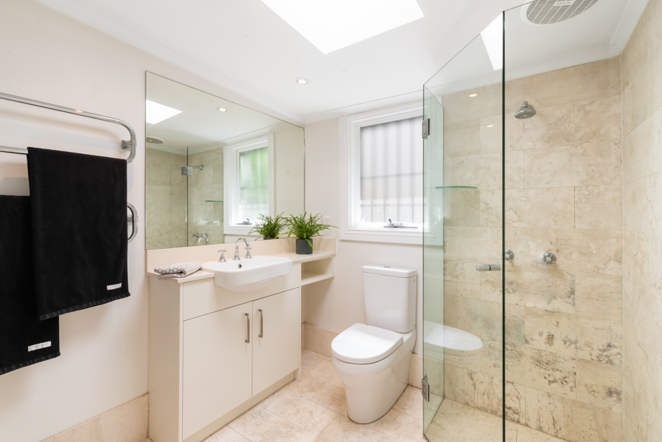 Modern bathroom with travertine tiles.